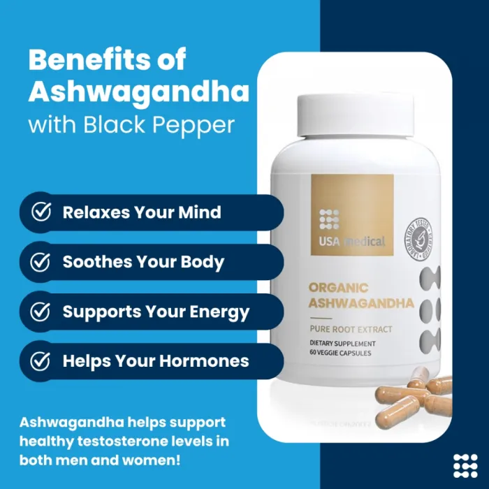 Introducing USA Medical Ashwagandha Capsules, a premium formulation designed to balance your hormones, relieve stress, and bring energy back to your life.